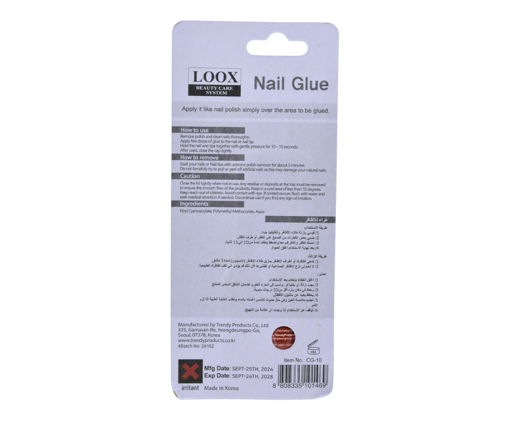 لاصق الأظافر من Loox مصمم خصيصًا لتثبيت الأظافر الصناعية والحريرية بفعالية وسرعة. بتركيبة تجف سريعًا وتدوم طويلًا، يساعد على إصلاح تشققات الأظافر ومنع تكسرها، مع ضمان مظهر صحي ومتناسق للأظافر.
